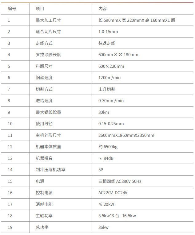 本機(jī)型為我公司在原有單板成熟機(jī)型的基礎(chǔ)上,根據(jù)客戶實(shí)際需求開(kāi)發(fā)的一種加長(zhǎng)版三主軸多線切割機(jī),本機(jī)型適合切割1.0-15mm厚度的材料,比原有小機(jī)型切割效率高,節(jié)省客戶切割成本。本機(jī)型采用雙錐面、龍門架設(shè)計(jì),三角架、主板、采用全鑄件提高了機(jī)器運(yùn)轉(zhuǎn)平穩(wěn)性和切割精度,結(jié)構(gòu)緊湊,維修方便。升降護(hù)罩,方便可靠。